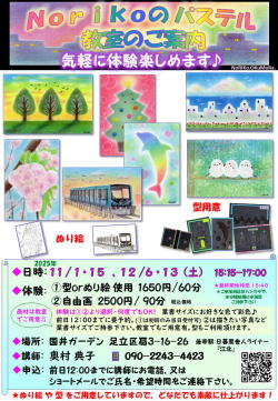 | ★こちらの内容は色の基本から絵をじっくり描いて いきたい方向けの講座案内になります。 初めての方は体験をご予約して下さい。 ※個別にお受け致します。 ***************************** パステルと色鉛筆教室 『Norikoのパステル』 土or日/月2回の開催 1講座 120分です。 ※事前申告で1日4時間 受講可。 ※会場:未定 / 受講料 別途ご案内 ◆サイズ:ミニスケッチブック 約B6 ◆選べる画材スターターキット購入と 共に毎回画材を持参する形式。 ★初回受講時にミニスケッチブックを プレゼント致します。 第1回目と第2回目のみ課題があり、 第3回目以降は課題を参考にしながら 各自のペースでお好きな絵が描ける 自由な形式です。 ◆第1回目 課題◆ 好きな3色を選び自由な絵を描く& 豆知識(光と色の三原色&補色)の筆記 ![]() R.S さんのミニスケッチブック ★クリックすると拡大します ◆第2回目 課題◆ パステルの3色(赤・黄・青+白)の混色で色を 作って楽しむ ![]() M.Y さんのミニスケッチブック ★クリックすると拡大します ◆第3回目 以降◆ 各自のペースで自由に好きな絵を描き ながら色の三原色、混色を実践で体感 その他 ※時間がある時任意 ・色鉛筆 色見本作成 ・パステル 色見本作成 など ![]() M.Y.さんのミニスケッチブック作品一覧 ★クリックすると拡大します ※ミニスケッチブック表頁から絵を 描きすすめ、裏頁から各人に 合わせた色の試し塗り、講師の 説明を入れていく為、オリジナル の作品集&資料集となります。 何度でも色の三原色を振り返り その都度、彩色の参考になります。 ※見本や参考となる葉書サイズの 写真やイラストなどを教室で ご用意。描きたいペットや動物 の写真などは各自ご持参下さい。 ◆画材:選べるスターターキット 購入持参 (フルセットで8000円程度) ※価格と内容は予告なく変動します。 画材についてはお申し込み時に 講師にご確認下さい。必要な一式を 持ち運べる事を前提に考えてセットに しています。 講師が指定する画材に準じるものを お持ちの場合はそちらをご持参頂き 必要なもの・足りないものをご購入 頂いております。 自由に描く他に、講師オリジナル デザインの型を使い、下描きせずとも 季節ごとの絵が好みの色で仕上がる 「パステルアート」又は、講師が 用意する「ぬり絵」も楽しめます。 イラストのイメージは ◆スケジュール案内のイラスト や、 ◆作品紹介&販売work & sale タブ ▼型使用&ぬり絵のパステルアート 作品 をご参照ください ★講座では画材キットには含まれて いない色ペンやパール系の パステル、パステルブラシを ご用意し、自由に使用できるように しています。 ★特典として、20回目毎に受講時 ミニスケッチブックを1冊、又は 講師オリジナルのポストカードを 1枚プレゼントします。 必要に応じてミニスケッチブック、 画材は受講時に購入も出来ます。 事前にお知らせ下さい。 ***************************** ◆お申込とキャンセルのご連絡は 3日前の12:00までにお願い致します。 ◆講師オリジナルの葉書、ぬり絵の 販売もしています。 ※対面販売特別価格 各1枚 170円 ◆講師の作品ポスターや複製印刷も 対面販売可能です。ホームページ 作品紹介ページをご参照頂き、 事前にお知らせ頂けたら幸いです。 ★ご連絡お待ちしています。 |