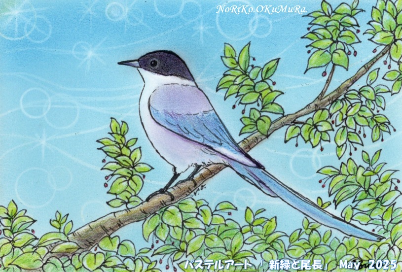 ぬり絵 『新緑と尾長』パステルと色鉛筆で彩色