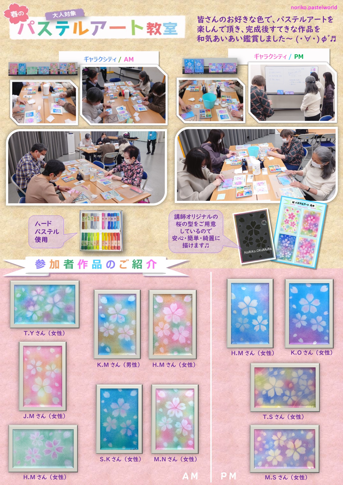 ◆ギャラクシティ / 大人対象(中学生以上) 春のパステルアート教室 2023年 3/11(土) 中学生以上どなたでもご参加OK ①10:00~11:30 / ②13:00~14:30 ギャラクシティ 主催 こども未来創造館 東京都足立区栗原1-3-1 BF2 レクリエーションホール1 オリジナルの桜の型を使って誰でも簡単に映える パステルアートが作れます♪ インスタグラムは2つに分けて投稿しています ★午前の部 体験者作品紹介 ★午後の部 体験者作品紹介 |